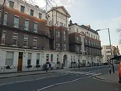 The hospital has its origins in the "Establishment for Gentlewomen During Temporary Illness" founded at Cavendish Square in March 1850.[3][4] On opening, it had 11 beds, and employed nurses as and when required.[1] Florence Nightingale became superintendent in August 1853, a week before it moved to Harley Street, and installed hot water on all floors, and a windlass to deliver hot foods quickly from the kitchen to beds. Under her governance, it was made non-sectarian and renamed the "Institute for Gentlewomen During Illness", taking in widows and daughters of professionals, the clergy and military personnel. She left for the Crimean War the following year.[4][1]