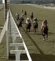 Nijinsky's first four races were all at the Curragh. In June, he started at odds of 4/11 and won the six-furlong Erne maiden race easily.[7] He followed up with wins in the Anglesey Stakes and the Railway Stakes. On his fourth appearance, he was extended for the first time in the Beresford Stakes. He won decisively from Decies, a colt who went on to win the Irish 2000 Guineas in 1970. Having proved himself the best of the Irish two-year-olds, he was sent to England in October to contest the Dewhurst Stakes at Newmarket. Ridden for the first time by Lester Piggott, he was held up at the back of the six-horse field before moving through to take the lead inside the final furlong, earning top rating in the British Free Handicap.[8][9]