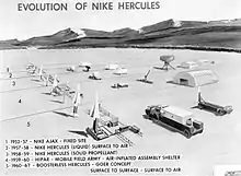 The Nike Hercules was a command-guided, long-range, high-altitude anti-aircraft missile.[9] It was normally deployed in fixed bases with a central radar and control site (Integrated Fire Control area or IFC) separated from the launcher area (LA). Hercules batteries in the US were generally placed in older Ajax bases, using their underground storage and maintenance buildings. 145 missile batteries were deployed during the cold war.