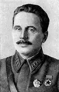 Vashugin had reportedly played an active part in the Great Purge, informing on several of his acquaintances and demonstrating "political zeal".[2][3] At 1937, he underwent advanced officers' training.[1] In 1938, holding the rank of a regimental commissar, he was rapidly promoted to divisional commissar and posted as the Leningrad Military District's Member of the Military Council – the district's supervising political officer.[4][5]