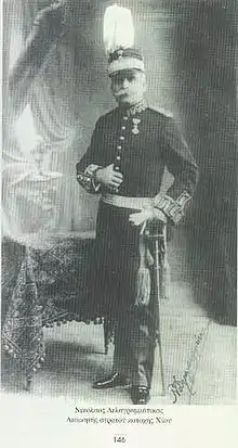 During the 1897 war he was a captain, and distinguished himself through his bravery in the Battle of Velestino, earning a field promotion.[2] On the outbreak of the First Balkan War, he commanded the 7th Infantry Regiment within the Army of Thessaly. Following the capture of Thessaloniki, he led a mixed force of regular and irregular forces to the capture of the island of Chios, which he accomplished against strong opposition by the Ottoman garrison. After the capture of Chios, he and his men were transferred to the Epirus sector, where he led one of the attack columns during the capture of Ioannina.[2] He subsequently served as CO of the 8th Infantry Division and then of the 6th Infantry Division, which he led during the Second Balkan War. He retired on 16 December 1916 with the rank of lieutenant general.[2]