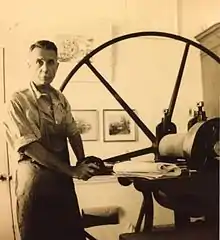 He started printmaking, specifically engraving in wood, etching on copper and stone (a relatively new technique, invented by the German Alois Senefelder), as early as 1932, feeling reluctant in respect to his tutor. But engraving won him over and he focused his interest in perfecting it. In his résumé he notes "self-taught excluding lithography which I was taught". He took some lithography (etching on stone) courses in 1937. Primarily the evolution of the engraving was personal and he evolved several variations of known techniques.