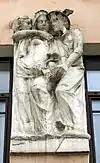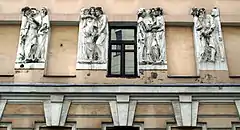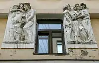 His use of sculpture has been linked to the legacy of Stroganov Institute school that focused on elaborate facade decorations.[3] However, none of contemporary architects used sculpture so frequently and on such scale as Zherikhov. His best known work, a small 4-story apartment building on the corner of Plotnikov and Maly Mogiltsevsky Lane, completed in 1907, features a band of 40 life-sized figures arranged in groups of two or three in explicitly erotic settings.[4] Three of the satyrs resemble Leo Tolstoy, Alexander Pushkin and Nikolay Gogol.[4] The name of the sculptor has been lost; perhaps it was Leeb Sinayev, author of Pushkin Museum friezes, or one of his disciples.[3] Tourist guides say that the building once housed a high-class brothel,[4] but the statement is refuted by historians as an urban legend.[3]