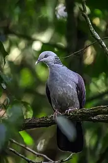 The Nilgiri wood pigeon (Columba elphinstonii) is large pigeon found in the moist deciduous forests and sholas of the Western Ghats in southwestern India. They are mainly frugivorous and forage in the canopy of dense hill forests. They are best identified in the field by their large size, dark colours and the distinctive checkerboard pattern on their nape.