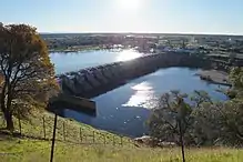 The Nimbus Dam is a base load hydroelectric dam on the American River near Folsom, California. Approximately 8,700 acre-feet (10,700 dam3) of water is retained by the dam. It is responsible for the impoundment of water from the American River to create the Lake Natoma reservoir. The dam stands 87 feet and spans 1,093 feet. The Nimbus powerplant consists of two generators. Each generator produces enough electrical power to power over 200,000 100-watt light bulbs, about 15,500 kilowatts of electrical power.[1] Nimbus Dam consists of 18 radial gates, each with their own gate bays. These 18 gates today are the ones that were completed in 1955 along with the rest of the dam. Of the eighteen gates, four of them have had their coating system replaced. This protects the gates from a faster rate of corrosion. The other fourteen gates have the original coating.[2]