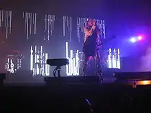 The band headlined the 2008 Lollapalooza festival,[59] the 2008 Virgin Festival,[60] and the first Pemberton Music Festival.[61] In May 2008, Nine Inch Nails announced that premium seating for all the upcoming 2008 tour shows would be offered in a pre-sale for fans who registered at the official Nine Inch Nails website. In an effort to combat ticket scalpers, each concert ticket will list the purchaser's legal name. The ticketing process was previously used for smaller pre-sales and was available exclusively to fan club members.[62][63] On July 26, Reznor introduced an "unplugged" portion into the live show in which the band steps to the front of the stage about an hour into the show, with Reznor on vibraphone and bassist Meldal-Johnsen playing an upright bass. The 20-minute jazzy, acoustic set is taken mostly from Ghosts I–IV. The stage show also featured mesh LED curtains that projected various visuals, ranging from falling rain to static to a ruined city, and made the band appear to be playing on "a stage that appeared to be constructed entirely out of lights."[64] Nine Inch Nails later confirmed that the tour was to extend to South America and it was thought this would be the last Americas set of dates but soon after Reznor announced yet more North American dates including two dates in tourist capital Florida.