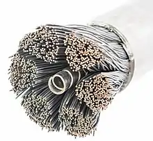 Mechanically, Nb3Sn is extremely brittle and thus cannot be easily drawn into a wire, which is necessary for winding superconducting magnets. To overcome this, wire manufacturers typically draw down composite wires containing ductile precursors. The "internal tin" process includes separate alloys of Nb, Cu and Sn. The "bronze" process contains Nb in a copper–tin bronze matrix. With both processes the strand is typically drawn to final size and coiled into a solenoid or cable before heat treatment. It is only during heat treatment that the Sn reacts with the Nb to form the brittle, superconducting niobium–tin compound.[10] The powder-in-tube process is also used.[2][11]