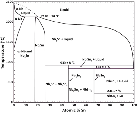 Niobium–tin is an intermetallic compound of niobium (Nb) and tin (Sn), used industrially as a type II superconductor. This intermetallic compound has a simple structure: A3B. It is more expensive than niobium–titanium (NbTi), but remains superconducting up to a magnetic flux density of 30 teslas [T] (300,000 G),[1] compared to a limit of roughly 15 T for NbTi.