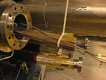 About 1,000 Nb-Ti SC magnets were used in the 4-mile-long main ring of the Tevatron accelerator at Fermilab.[6] The magnets were wound with 50 tons of copper cables, containing 17 tons of Nb-Ti filaments.[7] They operate at 4.5 K and generate fields of up to 4.5 T.