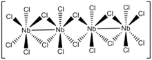 In the solid state, niobium(IV) chloride exists as chains of edge-sharing octahedra with alternating Nb-Nb distances of lengths 302.9 and 379.4 pm. The shorter distances correspond to Nb-Nb bonds, which result in the compound's diamagnetism. Its structure is very similar to that of tungsten(IV) chloride.