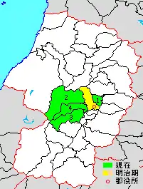 yellow & green area=original extent in Meiji period; green=present area; 1=Kahoku, 2=Nishikawa, 3=Asahi, 4= Ōe