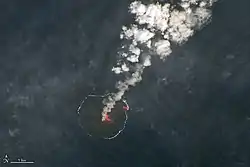 The eruption continued throughout the first half of 2015, and the island continued to expand. However, by August, the volcano ceased to erupt smoke and ash, but continued to emit lava.[26] As of 16 September 2015, the total area of the island had decreased slightly, but the fumarolic zone had expanded as "vigorous volcanic activity continued without significant change".[27] Eruptions resumed soon thereafter,[28] but 17 November 2015, was the date of the last observed explosive eruption.[29] Fumarolic activity continued, but decreased in amount as no new lava flows were observed.[29] Decreases in temperatures were also recorded, and subsidence was observed near the summit of the volcano.[29] In August 2016, the Japan Meteorological Agency announced that the alert level for the volcano had been lowered, and that the no-entry zone had been reduced from a radius of 2 km (1.2 mi) to a radius of 500 m (1,600 ft).[29][30] This would finally enable landings on the island. Water discoloration was still evident immediately offshore in August, indicating that volcanic activity, while in significant decline, was still present.[31] On 14 February 2017, the Japan Meteorological Agency cancelled all alerts for the island, declaring that there was no indication of subsequent eruptions.[32]