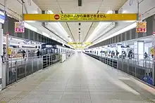 The station is located on the second floor of the Solaria Terminal Building within the Mitsukoshi Building. It uses the Spanish solution with 3 dead-end lines. After the train arrives, the doors open on the middle platform to let the passengers out. After this, the doors on the opposite side will open and the waiting passengers can enter the train.