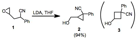The cyclization of ω-epoxy-1-nitriles provides an interesting example of how stereoelectronic factors may override steric factors in intramolecular substitution reactions. In the cyclization of 1, for instance, only the cyclopropane isomer 2 is observed. This is attributed to better orbital overlap in the SN2 transition state for cyclization. 1,1-disubstituted and tetrasubstituted epoxides also follow this principle.