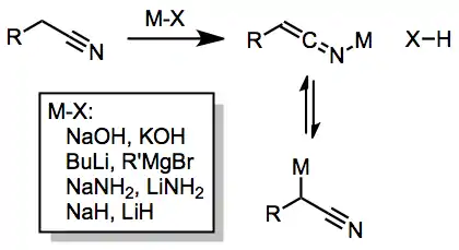 Arylacetonitriles (e.g. phenylacetonitrile) are sufficiently acidic to undergo deprotonation with aqueous base, e.g., under phase-transfer catalysis.[2][3] Nitrile anions can also be involved in Michael-type additions to activated double bonds and vinylation reactions with a limited number of polarized, unhindered acetylene derivatives.[4]