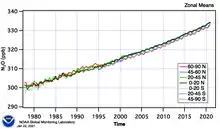 Nitrous oxide's atmospheric concentration reached 333 parts per billion (ppb) in 2020, increasing at a rate of about 1 ppb annually.[8][9] It is a major scavenger of stratospheric ozone, with an impact comparable to that of CFCs.[10] Global accounting of N