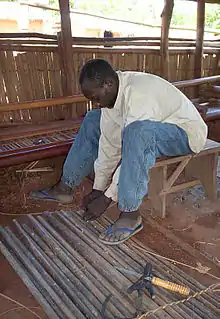 The traditional Njyem house is a rectangular structure made of leaves folded over a raffia branch and pinned in place with a small twig. Alternatively, strips of bark could be used for the sides. The A-shaped roof is covered in raffia palm leaves. Present-day houses are made of vertical poles with raffia strips lashed horizontally inside and out. Mud is packed between the poles and held in place by the raffia strips. The roofs continue to consist of thatches made of raffia palm leaves, although aluminium roofing is also being used when finances permit. Wealthier Njyem and those living in larger villages and towns often live in houses employing mud-blocks or concrete-blocks.