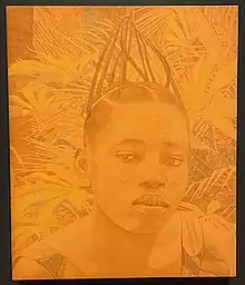 She uses photos she has taken herself in Nigeria along with family photos and pages from popular Nigerian magazines.[20] The photos "are layers in her work by collage and acetone-transfer prints, creating a fabric of images throughout her paintings".[21] Her primary mediums include collage, photo transfer, acrylic paint, charcoal, fabric, and colored pencil. Along with strong Nigerian influence, her style is also derived from pop culture, personal experience, and Western academia.[22] While creating, she thinks of her dual audience: American and Nigerian.[9] However, her work cannot be categorized as either American nor Nigerian, but rather the work is an autobiography based on her "character that doesn't fit into a box."[21]