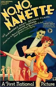 No, No, Nanette is a 1930 American pre-Code musical comedy film with Technicolor sequences that was directed by Clarence G. Badger and released by First National Pictures.[3] It was adapted from the play of the same title by Otto A. Harbach and Frank Mandel. No, No, Nanette was a popular show on Broadway, running for 321 performances, and was produced and directed by Harry Frazee.[4]