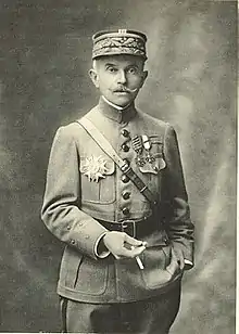 Garnier-Duplessix took over command of the 2nd Infantry Division from General Deligny on 8 September 1914.[5] This was whilst the division was engaged in the important First Battle of the Marne that thwarted the German Schlieffen Plan objective of quickly capturing Paris.[5] Garnier-Duplessix was subsequently posted to the French protectorate of Morocco where he came under the command of General Hubert Lyautey. In Morocco he was placed in command of a groupe mobile, a mobile combined arms force, based at Sidi Lamine and participated in the Zaian War against the Berbers of the Middle Atlas.[6] After the French defeat at the Battle of El Herri left Khénifra threatened with capture, Garnier-Duplessix led his groupe mobile 30 miles (48 km) through continuous Berber ambushes to relieve the strategically important town within three days.[6] He was appointed an officer of the Legion of Honour on 3 December 1914.[7]