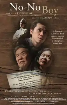 No-No Boy (2010) is a play written by Ken Narasaki adapted from the novel of the same title by John Okada, originally produced at the Miles Memorial Playhouse in Santa Monica, California, in association with Timescape Arts Group. It is a drama in two acts. (Each act was approximately 50 minutes in length and there was a 15-minute intermission.) The play was directed by Alberto Isaac,[1] and received its world premiere on Saturday, March 27, 2010. (There was a preview on Friday, March 26, 2010 and it closed on Sunday, April 18, 2010.) The story follows a Japanese American World War II draft resister as he returns home from prison, in 1946.