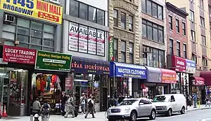 The neighborhood deteriorated somewhat during the mid- and late-twentieth century. Tee-shirt, luggage, perfume and jewelry wholesalers began lining the storefronts along Broadway from Madison Square to Herald Square, and wholesalers continue to dominate that stretch. By the second half of the twentieth century, Madison Square Park was suffering from neglect and petty crime.[19] The massive 2001 park restoration project, spearheaded by the Madison Square Park Conservancy[20] spurred a transformation of the neighborhoods around the park—the Flatiron District, Rose Hill and NoMad—from primarily commercial to places attractive for residences, upscale businesses and trendy restaurants and nightspots, especially in the early 2010s.[21]
