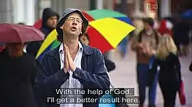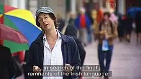 No Béarla is a four-part documentary style programme broadcast on Irish language television channel TG4 and produced by Dearg Films RTÉ/TG4. It follows presenter Manchán Magan[1] as he journeys throughout Ireland attempting to show that Irish is spoken only by a minority of the population. The title is derived from the English negative "No" and the Irish word for the English language, "Béarla". The theme tune is "Boulevard of Broken Dreams" by Green Day. The first series was originally broadcast on Sunday nights between 21:30 and 22:00 and repeated on Wednesday evenings between 19:30 and 20:00. It aired from 7 January until 28 January 2007. The second series was first broadcast on Fridays at 19:30, beginning on 28 March 2008.