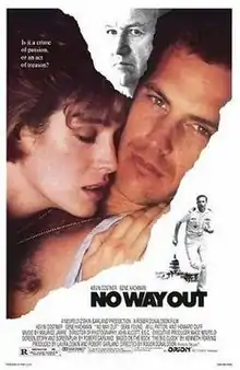 No Way Out is a 1987 American neo-noir[1] political action thriller film directed by Roger Donaldson and starring Kevin Costner, Gene Hackman, Will Patton, and Sean Young. Howard Duff, George Dzundza, Jason Bernard, Fred Thompson, and Iman appear in supporting roles. The film is based on the 1946 novel The Big Clock by Kenneth Fearing, previously filmed as The Big Clock (1948) and Police Python 357 (1976).
