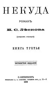 No Way Out (Russian: Не́куда, romanized: Nekuda) is an anti-nihilist novel by Nikolai Leskov, published in 1864 under the pseudonym M.Stebnitsky in Biblioteka Dlya Chteniya.[1] The original epigraph ("The slow one will be God-provided, the quick one will run up himself to grab. A proverb".) has been later removed. During the author’s lifetime the novel was re-issued five times: in 1865, 1867, 1879, 1887 and 1889.[2]