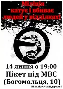 - June 24 - Activists organized a procession from the Square of Contracts to Mykhailivska Square. Activists performed a theatrical performance titled "The kitchen of death." Apart from demands to punish those guilty in Indylo's death and those of high-profile cases of police brutality, the new more global demands appeared: to strengthen punishment for misconduct, especially for tortures by policemen; to expand the powers of Ukraine Parliamentary Commissioner for Human Rights; to reestablish public councils in all territorial divisions of Ministry of Internal Affairs; and to establish transparent mechanisms for public access to monitor the work of police and others.