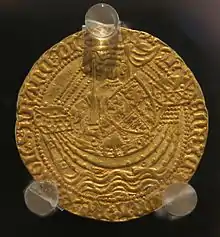 Edward III Second Coinage obverse legend: EDWAR DGRA REX ANGL Z FRANC DNS HYB ("Edward by the grace of God King of England and France Lord of Ireland"). Design: The king, holding a sword and shield in a ship. Reverse legend: IHC AUTEM TRANSIENS PER MEDIUM ILLORUM IBAT ("But Jesus passing through their midst went His way"). Design: 'L' in centre of a cross. The image of the ship and the Biblical text (from the Gospel of Luke 4:30) commemorate Edward's victory at the Battle of Sluys in 1340.[1]