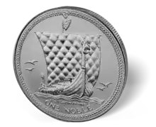 Reverse: shows a viking ship and four birds with the denomination. In small lettering beneath the ship, metal content, coin size and fineness are given. The design is framed by an elaborate Viking knit motif border with the island's coat of arms, the triskele, appearing at the top, above the ship's flag.