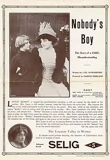 Nobody's Boy is a 1913 American silent film drama produced by Hardee Kirkland. The film stars Clarence Jonstone, Adrienne Kroell and Rose Evans. The film status is uncertain but a release flier survives which is now at the Margaret Herrick Library at the Academy of Motion Pictures Arts and Sciences, it was part of the Charles G. Clarke collection. Its reel was about 700 feet (210 meters) long. The film was released on the same reel with The Yosemite Valley in Winter.