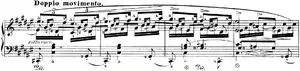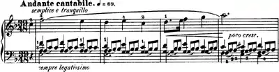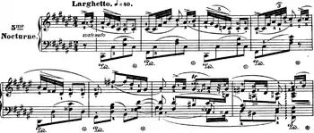 4 time. The first section, marked Larghetto, features an intricate, elaborately ornamental melody over an even quaver bass. The second section, labeled doppio movimento (double speed), resembles a scherzo with dotted quaver-semi quaver melody, semiquavers in a lower voice in the right hand, and large jumps in the bass. The final section is a shortened version of the first (14 bars rather than 24) with characteristic cadenzas and elaboration, finishing with an arpeggio on F♯ major, falling at first, then dying away. Many consider this nocturne to be the best of the opus, stating that its musical maturity matches some of his later nocturnes."[2] Pianist Theodor Kullak remarked about this piece, "The return of the heavenly opening theme... touches [one] like a benediction."[2]