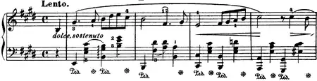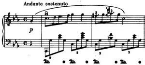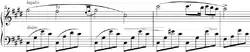 Chopin's nocturnes carry many similarities with those of Field while at the same time retaining a distinct, unique sound of their own. One aspect of the nocturne that Chopin continued from Field is the use of a song-like melody in the right hand. This is one of the most if not the most important features to the nocturne as a whole. The use of the melody as vocals bestowed a greater emotional depth to the piece, drawing the listener in to a greater extent.[5] Along with the right-hand melody, Chopin continued the use of another nocturne "necessity", that of playing broken chords on the left hand to act as the rhythm under his right-handed "vocal" melody. Another technique used by Field and continued by Chopin was the more extensive use of the pedal. By using the pedal more, the music gains more emotional expression through sustained notes, giving the piece an aura of drama.[9] With these main attributes of the "Field nocturne" Chopin was inspired, and expanded upon them to develop the "Chopin nocturne".