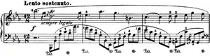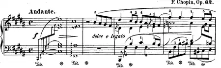 One of the greatest innovations made by Chopin to the nocturne was his use of a more freely flowing rhythm, a technique based on the classical music style. Also, Chopin further developed the structure of the nocturne, taking inspiration from the Italian and French opera arias, as well as the sonata form. Composer Franz Liszt even insisted that Chopin's nocturnes were influenced by Vincenzo Bellini's bel canto arias,[10] a statement affirmed and echoed by many in the music world. A further innovation of Chopin's was his use of counterpoint to create tension in the nocturnes, a method that even further expanded the dramatic tone and feel of the piece itself.[5] It was mainly through these themes of operatic influence, freer rhythms, and an expansion into more complex structures and melodic playing that Chopin made his mark on the nocturne.[9] Many think of the "Chopin nocturne" as a mix between the form and structure of Field and the sound of Mozart, displaying a classic/romantic-influenced theme within the music.[5]