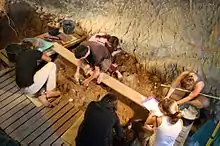 The presence of paleo-human remains in the cave was first suggested in 1898 by Armand Viré but only in 1985 it was visited again by caver E. Casteret who reported to the Regional Archaeology Service of the Midi-Pyrénées department. An initial survey operation was conducted in 1987 under the direction of Michel Allard in order to investigate the extent and impact of decades of illegal levies. Two field sessions in 1992 and 1993 were undertaken to assess the archaeological significance of the site and to determine appropriate protection measures. The subsequent excavation probe of a few square meters lead to the discovery of several cultural layers, relatively rich in Mousterian lithic vestiges and faunal remains and it was determined to permanently protect the site with a strong barred gate at the entrance.[5] This rescue campaigns's results remained mainly unpublished. In a few brief notes the site is usually presented as a temporary occupation site or hunting camp specialized on chamois (Rupicapra pyrenaica) and ibex (pyrenaica pyrenaica).[6] In 2004, another interdisciplinary research excavation was launched at the site, that lead to a number of new discoveries, in some cases results were contrary to earlier ones. The discovery of juvenile Neanderthal teeth, for example contradicts the hunting camp hypothesis of the site.