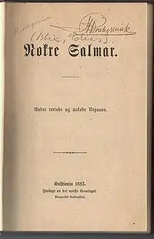 Nokre salmar (Some Hymns) was the first Nynorsk hymnal. It was published anonymously by Elias Blix.[1] The volume was first issued as smaller booklets, with the first in 1869,[1][2] and then in 1870 and 1875, and then in an expanded version in 1883 published by Det Norske Samlaget.[1] On March 4, 1892 Nokre Salmar was authorized for use in public worship, and these Landsmål hymns were then incorporated into Landstad's hymnal as nos. 635 to 791.[2]