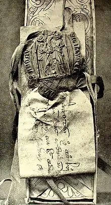 Four so-called "great relics" belong to Aachen cathedral: The dress of Mary, the diaper of Jesus, the decapitation cloth of John the Baptist and the loincloth of Christ, along with other lesser relics. Since 1349, these cloths have been displayed and venerated as contact relics in Aachen every seven years during the Aachen pilgrimage. One legend says that it was during such a pilgrimage that a pilgrim was able to remove and steal a small part of each of the sacred cloths, despite the strict guard. At the death of this pilgrim a year later, he is said to have repented of his deed and returned the stolen fabric to the Aachen cathedral chapter. The canon of cathedral chapter is said to have been so embarrassed by this evidence of his negligence that, in 1356, he ordered the production of a small silver box to store the returned bits of relic in. After the casket was locked, he wrapped it in a green silk ribbon, sealed it and attached a parchment, on which was written in Medieval Latin: