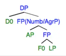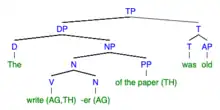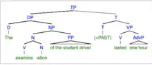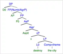 Alexiadou (2001) adopts a structural approach to accounting for eventative versus non-eventative interpretations of deverbal nominalization.[19] Her analysis posits that both interpretations (process nouns and result nouns) are associated with a distinct syntactic structure.[20] Alexiadou (2001) proposes that the functional structure of process nominals is much like that of verbs by including verb-like projections such as Aspect Phrase (AspP) and a light Voice Phrase (vP), but result nominals differ from verbs and have no Aspect Phrase or light Voice Phrase included in its functional structure therefore resembling the structure of an underived noun.[20]
