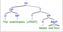 The second instance of examination has a simple event interpretation because while it is a derived nominal, according to Grimshaw, it does not "inherit" the verbal argument structure, and only the lexical/semantic content is projected.[19] The suffix, -ation, is attached to a verb, "examine." The interpretation of the sentence "The examination lasted one hour" is "The exam took one hour."