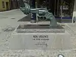 The oversized public version of the piece was planned for John Lennon’s memorial Strawberry Fields in Central Park.[5] This sculpture was made 1984,[6] but when the memorial was opened in 1985 Reuterswärd opted not to have it placed there, citing fears it would be stolen.[7] In 1988, the Luxembourg government bought and donated it to the United Nations. The sculpture was moved right outside of the headquarters of the UN.[8][9] Here it was interpreted not only a memorial for John Lennon, but as a symbol against violence and war anywhere in the world.