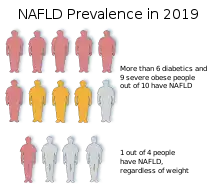NAFLD is the most common liver disorder worldwide and is present in approximately 25% of the world's population.[15] It is very common in developed nations, such as the United States, and affected about 75 to 100 million Americans in 2017.[16][17][18][19] Over 90% of obese, 60% of diabetic, and up to 20% of normal-weight people develop NAFLD.[20][21] NAFLD is the leading cause of chronic liver disease[19][20] and the second most common reason for liver transplantation in the US and Europe as of 2017.[10] NAFLD affects about 20 to 25% of people in Europe.[14] In the United States, estimates suggest between 30 and 40% of adults have NAFLD, and about 3 to 12% of adults have NASH.[3] The annual economic burden was approximately US$103 billion in the US in 2016.[20]