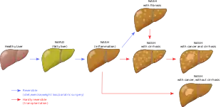 Non-alcoholic fatty liver disease (NAFLD), also known as metabolic (dysfunction) associated fatty liver disease (MAFLD), is excessive fat build-up in the liver without another clear cause such as alcohol use.[2][3] There are two types; non-alcoholic fatty liver (NAFL) and non-alcoholic steatohepatitis (NASH), with the latter also including liver inflammation.[3][4][7] Non-alcoholic fatty liver is less dangerous than NASH and usually does not progress to NASH.[3] When NAFL does progress to NASH, it may eventually lead to complications such as cirrhosis, liver cancer, liver failure, or cardiovascular disease.[3][9]