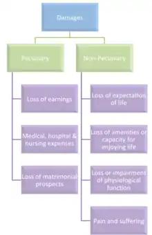 Non-economic damages caps are tort reforms to limit (i.e., "cap") damages in lawsuits for subjective, non-pecuniary harms such as pain, suffering, inconvenience, emotional distress, loss of society and companionship, loss of consortium, and loss of enjoyment of life.[1][2] This is opposed to economic damages, which encompasses pecuniary harms such as medical bills, lost wages, lost future income, loss of use of property, costs of repair or replacement, the economic value of domestic services, and loss of employment or business opportunities.[2][1] Non-economic damages should not be confused with punitive or exemplary damages, which are awarded purely to penalise defendants and do not aim to compensate either pecuniary or non-pecuniary losses.[1]