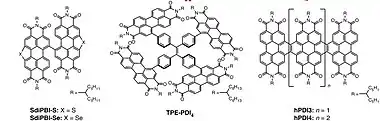 Rylene diimides are considered good acceptors because of their favourable properties. Rylene diimides usually have high electron mobility values due to intermolecular π-stacking.[7] These values are comparable to ones of fullerene acceptors. Furthermore, Rylene diimides also have a high absorbance spectrum in the visible area, high thermal and oxidative stability and their electric affinities can be tuned to a great extent by adding side groups and 3D-structure which leads to a significant higher open-circuit voltage ()[1] Challenges that must be faced by designing and improving Rylene diimides based OSCs are mainly concerned by synthesis of PDIs because the planar structure of the molecule makes that it tends to aggregate into a crystal structure. This greatly enhances the domain size, larger than the preferred 20 nm, in the bulk heterojunction which leads to a lower charge transport ability. Researchers have tried to reduce this aggregation by three structure adaptions, all focused on enhancing the mobility of Rylene diimides molecules. The first approach is to link two PDI molecules with a single carbon bond, to form a so-called twisted dimer. The second synthesis forms highly twisted 3D-structures of PDI molecules and the third approach forms a fused-ring structure.[1] For all three possible ways, an example molecule is shown in the figure below. These derivatives are examples of acceptor-molecules which were tested and assessed in OSCs for their performance and PCE. Future research will focus on developing better PDIs resulting in higher PCE values for the OSC.