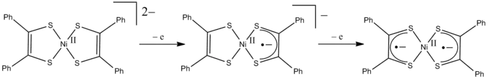 - dithiolenes, such as maleonitriledithiolate (see example of [Ni(S2C2Ph2)2]n− above).
