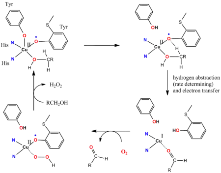 The catalytic cycle of galactose oxidase (GOase) illustrates the involvement of non-innocent ligands.[15][16] GOase oxidizes primary alcohols into aldehydes using O2 and releasing H2O2. The active site of the enzyme GOase features a tyrosyl coordinated to a CuII ion. In the key steps of the catalytic cycle, a cooperative Brønsted-basic ligand-site deprotonates the alcohol, and subsequently the oxygen atom of the tyrosinyl radical abstracts a hydrogen atom from the alpha-CH functionality of the coordinated alkoxide substrate. The tyrosinyl radical participates in the catalytic cycle: 1e-oxidation is effected by the Cu(II/I) couple and the 1e oxidation is effected by the tyrosyl radical, giving an overall 2e change. The radical abstraction is fast. Anti-ferromagnetic coupling between the unpaired spins of the tyrosine radical ligand and the d9 CuII center gives rise to the diamagnetic ground state, consistent with synthetic models.[17]