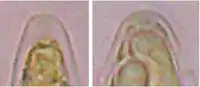 In mycology a tissue or feature is said to be amyloid if it has a positive amyloid reaction when subjected to a crude chemical test using iodine as an ingredient of either Melzer's reagent or Lugol's solution, producing a blue to blue-black staining. The term "amyloid" is derived from the Latin amyloideus ("starch-like").[1] It refers to the fact that starch gives a similar reaction, also called an amyloid reaction. The test can be on microscopic features, such as spore walls or hyphal walls, or the apical apparatus or entire ascus wall of an ascus, or be a macroscopic reaction on tissue where a drop of the reagent is applied. Negative reactions, called inamyloid or nonamyloid, are for structures that remain pale yellow-brown or clear. A reaction producing a deep reddish to reddish-brown staining is either termed a dextrinoid reaction (pseudoamyloid is a synonym) or a hemiamyloid reaction.