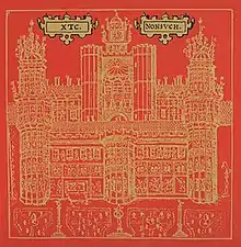 The album cover features an illustration of the palace, taken from a 1611 map of Surrey by John Speed.[7] Deborah A. Levinson of The Tech felt that the "certain formal elegance" of the Nonsuch Palace illustration and the typeface used in the packaging—a variation of Caslon, albeit with wobbly, uneven letters intended to appear like handwriting—displays a "gracefulness that nulls the listener, making Nonsuch sound harmless, when in fact it's XTC's most political album."[26] Each song on the album has its own illustration on the back cover. Partridge explained: "[T]hey call them chapbook drawings, they're supposed to educate children, you know, you gave a pic then you have a word underneath it, and the child is supposed to look at the drawing and copy the word and all that sort of stuff."[44]